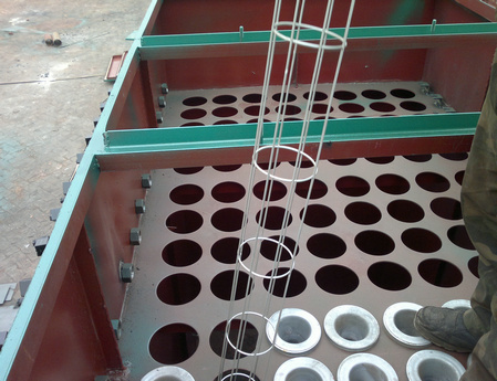 袋籠上部的護蓋確實壓在箱體內花板孔上為止。為防止布袋踩壞,要求每裝好一個布袋,_裝一個除塵骨架。