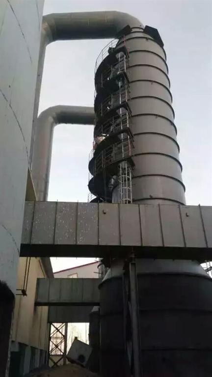 燃煤鍋爐產生的污染煙氣_入布袋多管除塵器,經除塵器除去粉塵后,由引風機抽出正壓吹入霧化噴淋式脫硫塔內(煙氣進口設置在脫硫塔中下部),在脫硫塔的入口處設置了預降溫、脫硫系統,經過降溫增濕并脫去部分SO2后的煙氣進入脫硫塔。在脫硫塔內煙氣由下而上與噴淋漿液逆流接觸,兩者充分混合。塔內設置三層_霧化系統,在該區段空間充滿著由霧化器噴出的粒徑為100~300μm的霧化液滴,煙氣中SO2與吸收堿液再次反應,脫除95%以上的二氧化硫。噴霧系統的合理選型及科學布置,使該霧化區形成無死角、重疊少的霧狀液體均勻分布的霧化區段,煙氣較長時間內在霧化區中穿行,煙氣中SO2有了充足的機會與脫硫液接觸,并不斷與霧滴相碰,其中SO2與吸收液進行反應,從而被脫除,同時殘留煙塵被帶上“水珠”,質量增大。