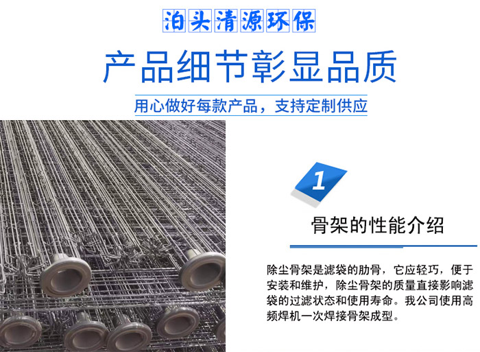 除塵框架也叫除塵框架,它是采用_技術,一次成型的全自動焊接設備制造生產的。除塵骨架性能_、無脫焊、毛刺,設計結構堅強可靠,安裝更方便,使用壽命更長。除塵骨架焊接牢固,外表光潔挺直。除塵骨架是除塵布袋的肋骨,即除塵器的重要配件。除塵骨架的質量直接影響濾袋的工作狀態與使用壽命。