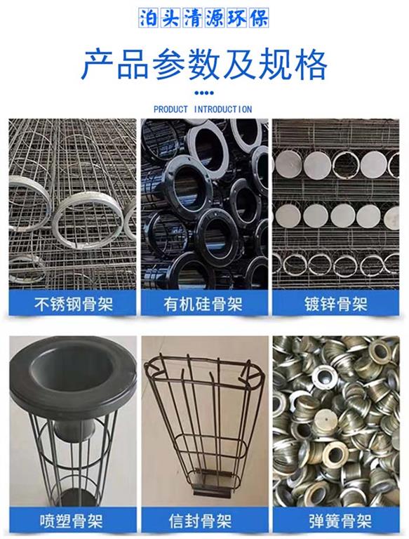 清源環保公司可以提供各種型號,圓骨架、扁骨架、彈簧骨架、多節異型骨架,材質有_、耐酸堿、碳鋼、鍍鋅、電鍍、不銹鋼等。另備有拉伸文氏管,可根據用戶要求焊接在籠口上,文氏管、短管、吊口、布袋喉箍等配件,并可按客戶要求制做非標準的籠架。