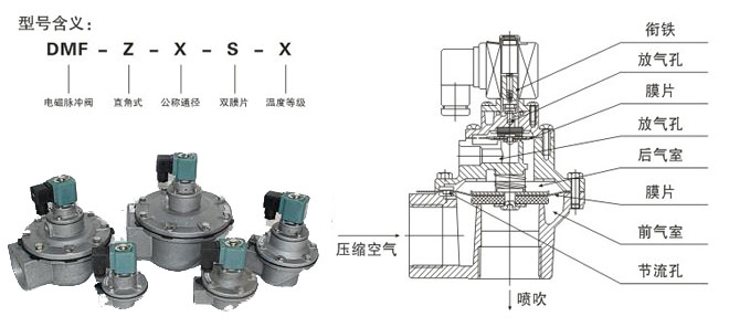 DMF-Z型電磁脈沖閥為直角式閥,其進出口之間夾角為90°,適合于氣包與除塵器噴吹管的安裝連接。氣流暢通,能提供符合要求的清灰氣脈沖.